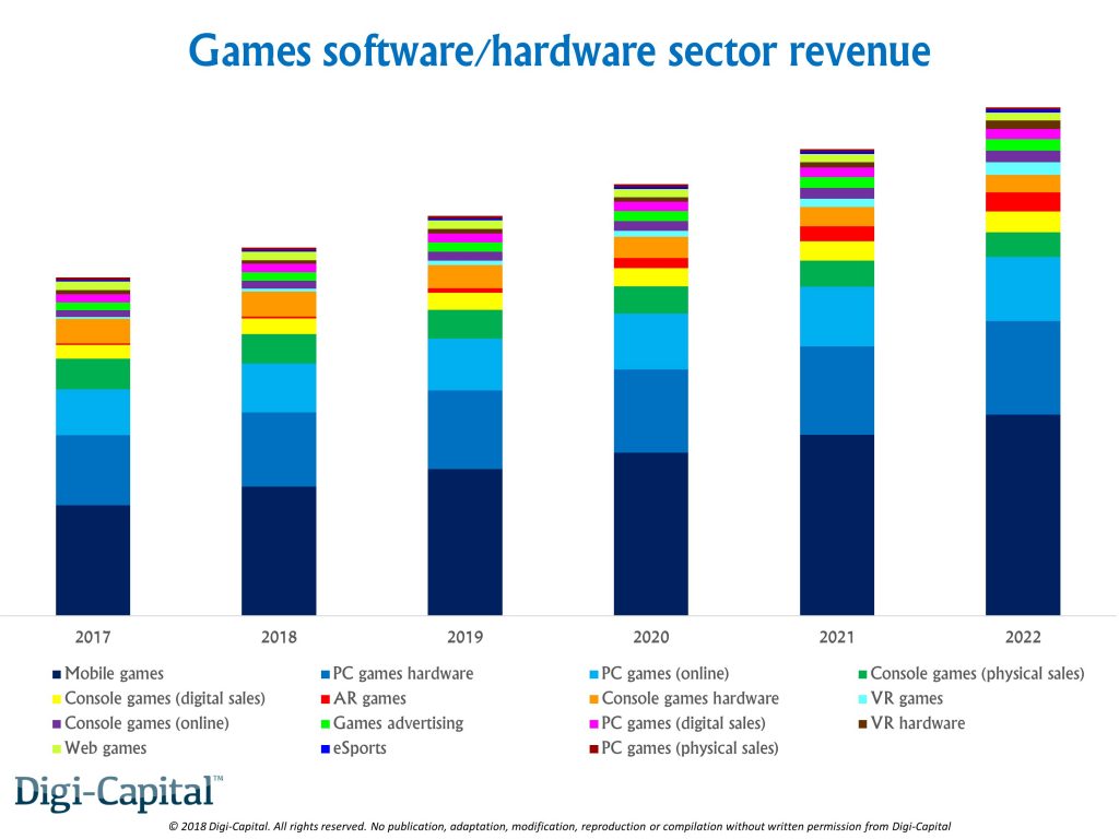 2018年,视频游戏软件/硬件的总收入将达到1650-1700亿美元之间。到2022年将达到2300 -2350亿美元。未来五年,游戏软件将占该市场的3/4左右,而硬件则是其余部分。