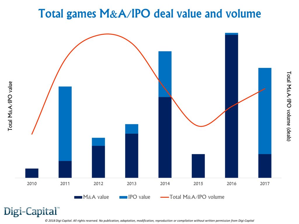 相比之下,2017年游戏行业并购交易额降(50亿美元)至2015年以来的最低点,主要由于缺少大宗并购案。但是游戏IPO市场有所反弹。