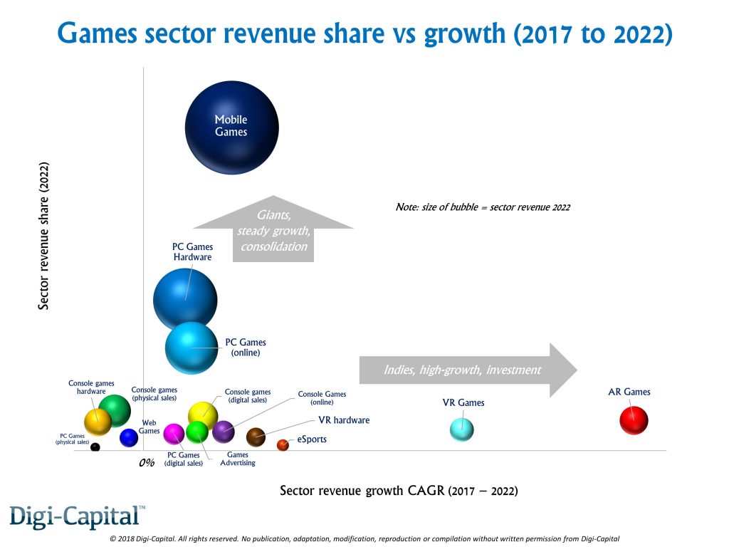根据Digi-Capital的数据,如果手机游戏应用继续保持强劲增长势头,今年收入将达到550-600亿美元,到2022年将增长至900-950亿美元。2018年,PC游戏硬件收入在300-350亿美元,到2022年增长至400-450亿美元。PC网络游戏收入在今年将达到200-250亿美元,2022年增长至250-300亿美元。
