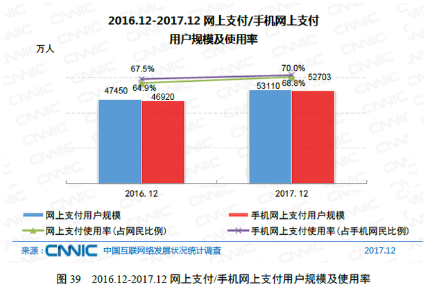 截至2017年12月,我国使用网上支付的用户规模达到5.31亿,较2016年底增加5661万人,年增长率为11.9%,使用率达68.8%。其中,手机支付用户规模增长迅速,达到5.27亿,较2016年底增加5783万人,年增长率为12.3%,使用比例达70.0%。