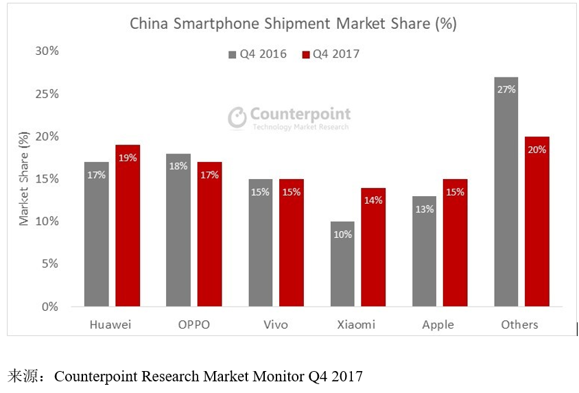 2017年,小米凭借丰富的机型组合和积极的线下扩张再度回归,表现抢眼。2017年第四季度,小米的市场份额大幅增至14%,是中国Q4增速最猛的品牌(同比增长31%)。这使得小米2017全年的市场份额达到12%,排名超过苹果。