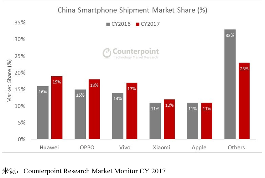 国际知名市场调研公司Counterpoint Research的最新研究数据显示,2017全年中国智能手机市场出货量较去年下降1%,但销量同比增长5%。2017年第四季度中国市场出货量同比下降5%,但受手机厂商“双十一”和“双十二”大力促销的推动,出货量较第三季度度增长5%。