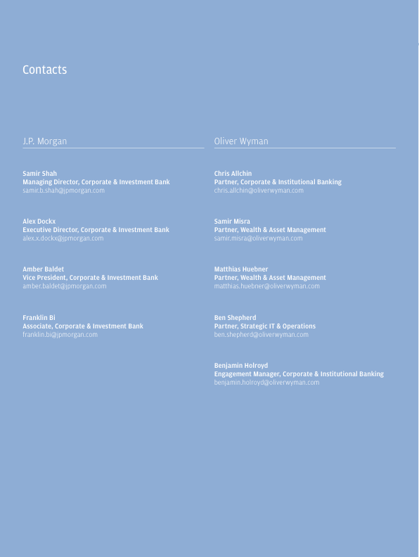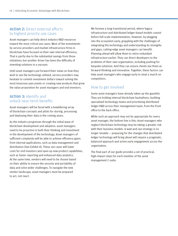 - 对于资产管理经理来说早期参与对优先处理正确的问题以及选择合适的应用场景很重要;早期同合作伙伴合作开发真正的解决方案可以为资产管理机构带来竞争优势。