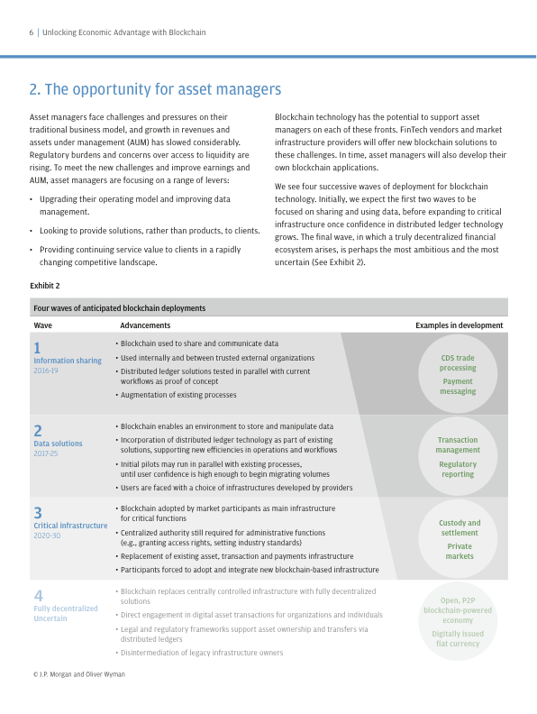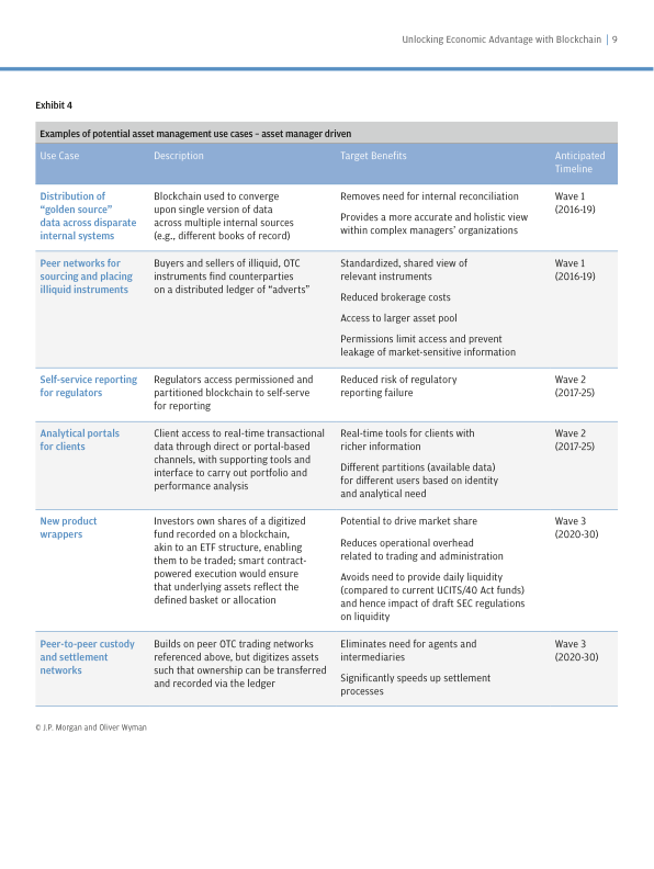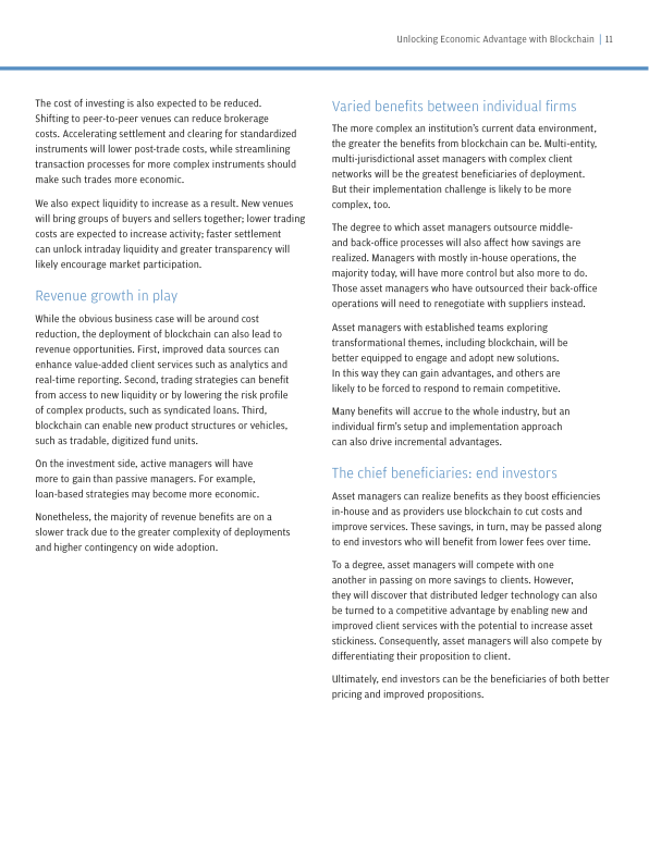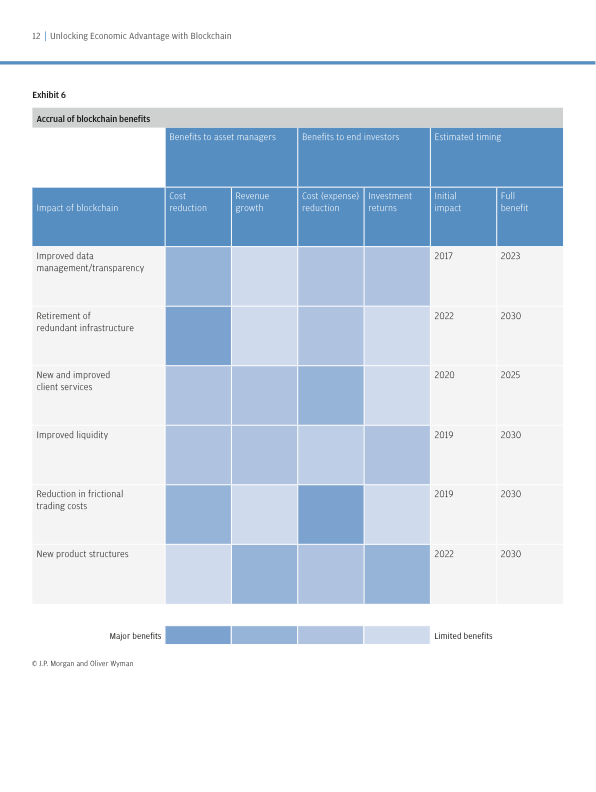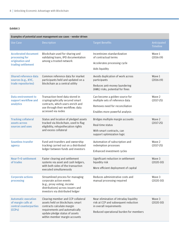 - 改善数据源,更好的流动性,以及区块链所带来的摩擦成本降低会带了更多的收入。资产管理经理将以全新的方式服务客户,比如,实时报告或交替改变交易策略。