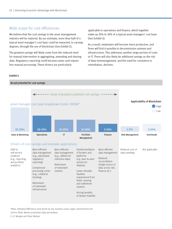 - 通过在前台,中台和后台业务环节中,减少数据处理,淘汰传统的基础设施,降低投资中的摩擦成本,资产管理经理可以在成本方面获得实实在在的好处。