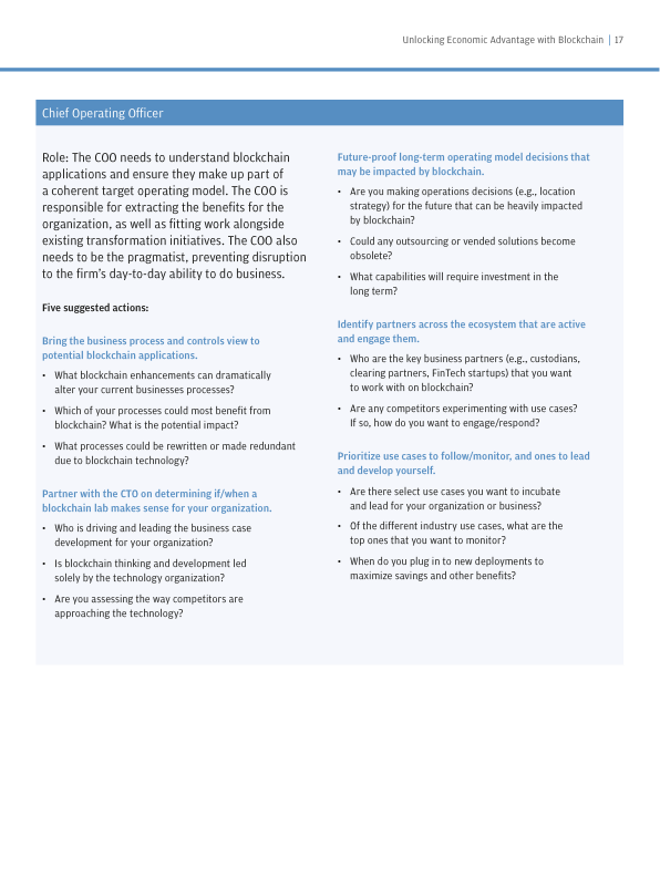- COO需要理解区块链的应用以及发挥区块链的优势,同时保证区块链能够成为公司目标运营模式中的一部分。