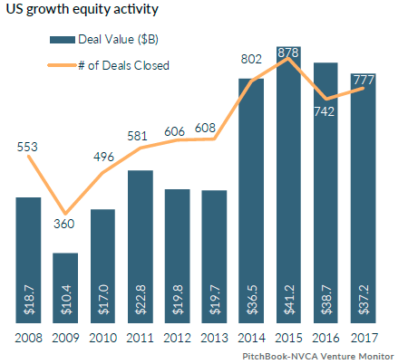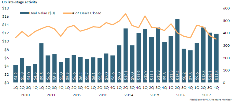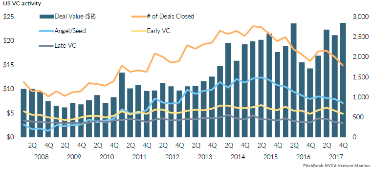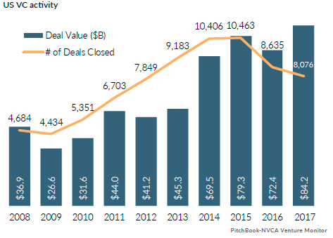 2017年,美国风险投资行业投资额超过840亿美元,同比增长16%,是互联网时代的最高水平。每个阶段的平均交易规模都达到了十年来的最高点,后期阶段平均交易额超过3000万美元。