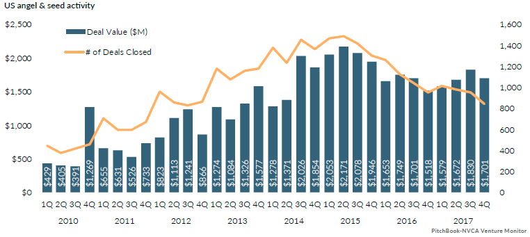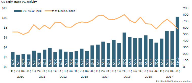 第四季度早期阶段风险投资额首次超过100亿美元,较前一季度增长40%,主要由于若干大宗投资。