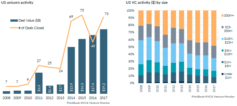 尽管独角兽仅占2017年风险投资活动的1%,投资(190亿美元)却占22%。