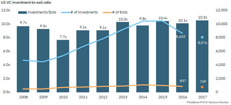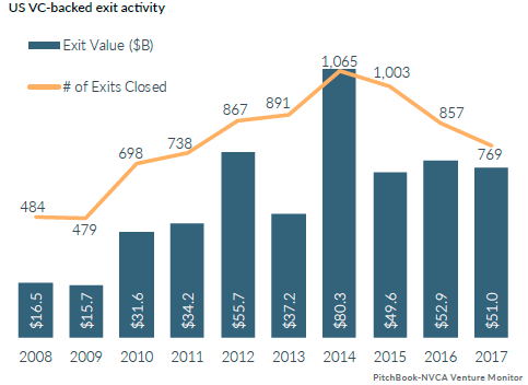 2017年投资退出量同比下降10%,但是投资退出交易额保持高点。