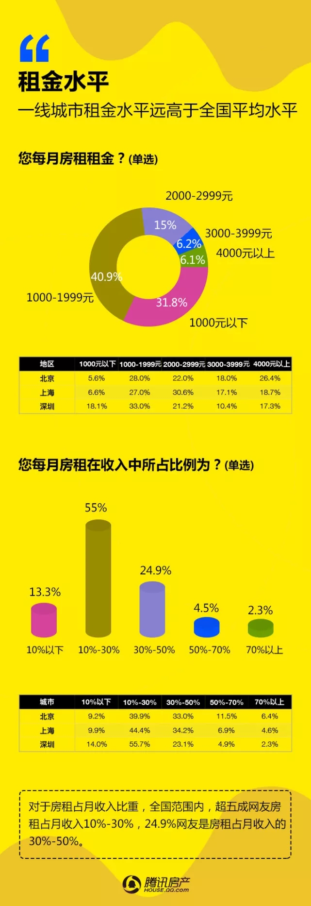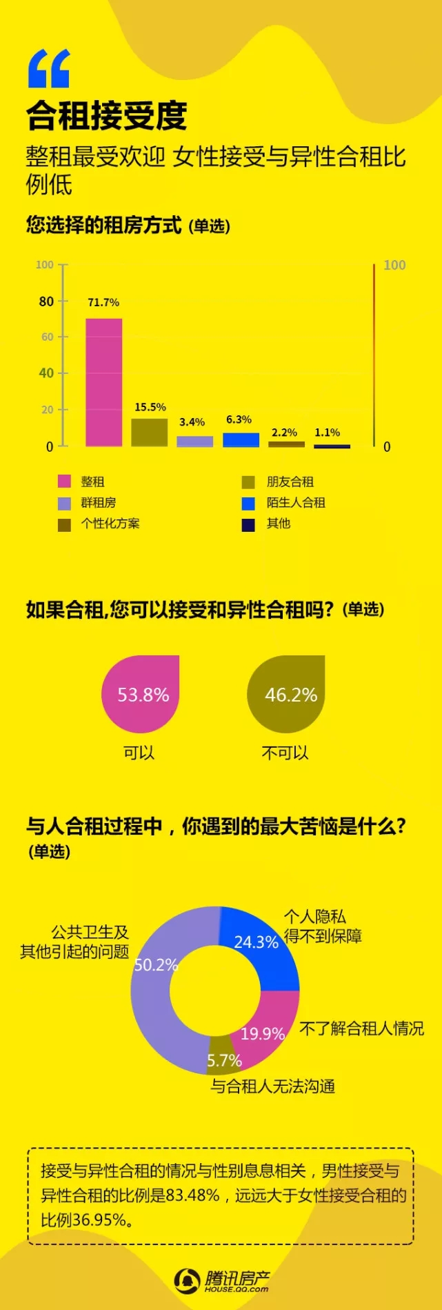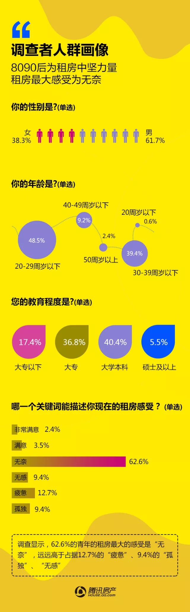 腾讯房产:2017租赁时代白皮书 由腾讯房产发布的《2017租赁时代白皮书》于1月11日新鲜出炉,通过多个城市在线调查得出,有超过42万网友成功填写了调查问卷。 本次调查针对人群画像、租房感受、租房渠道、偏好选择、承受能力、换租情况等多个维度进行分析。调查显示,62.6%的租户对于租房的感受是“无奈”;50.5%的租户租房渠道是通过中介;65.05%的女性租户表示不能接受与异性合租;75.5%的网友拒绝一辈子租房过日子…… 更多阅读:微信生活白皮书:图解我们的数据中国留学生白皮书腾讯娱乐&艾漫数据:2015年腾讯娱乐白皮书–电视篇腾讯娱乐&艾漫数据:2015年腾讯娱乐白皮书–明星篇腾讯娱乐&艾漫数据:2015年腾讯娱乐白皮书–明星篇2019海信互联网电视白皮书北京师范大学:2019中国教师培训白皮书新氧:2019医美行业白皮书青橙:2016-2017中国健身行业白皮书复旦发展研究院:中国女性养老与风险管理白皮书头条指数:2019年艾滋病资讯白皮书科赛:2018数据人才白皮书CiC:2021年智慧城市白皮书小葫芦:2020直播电商白皮书南方电网:2020年数字电网白皮书