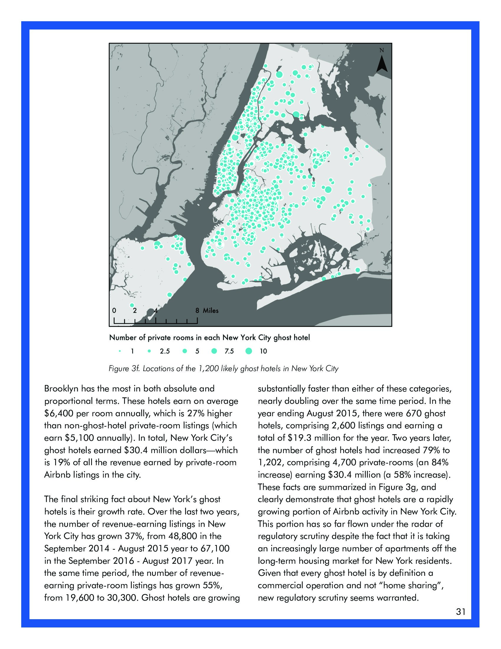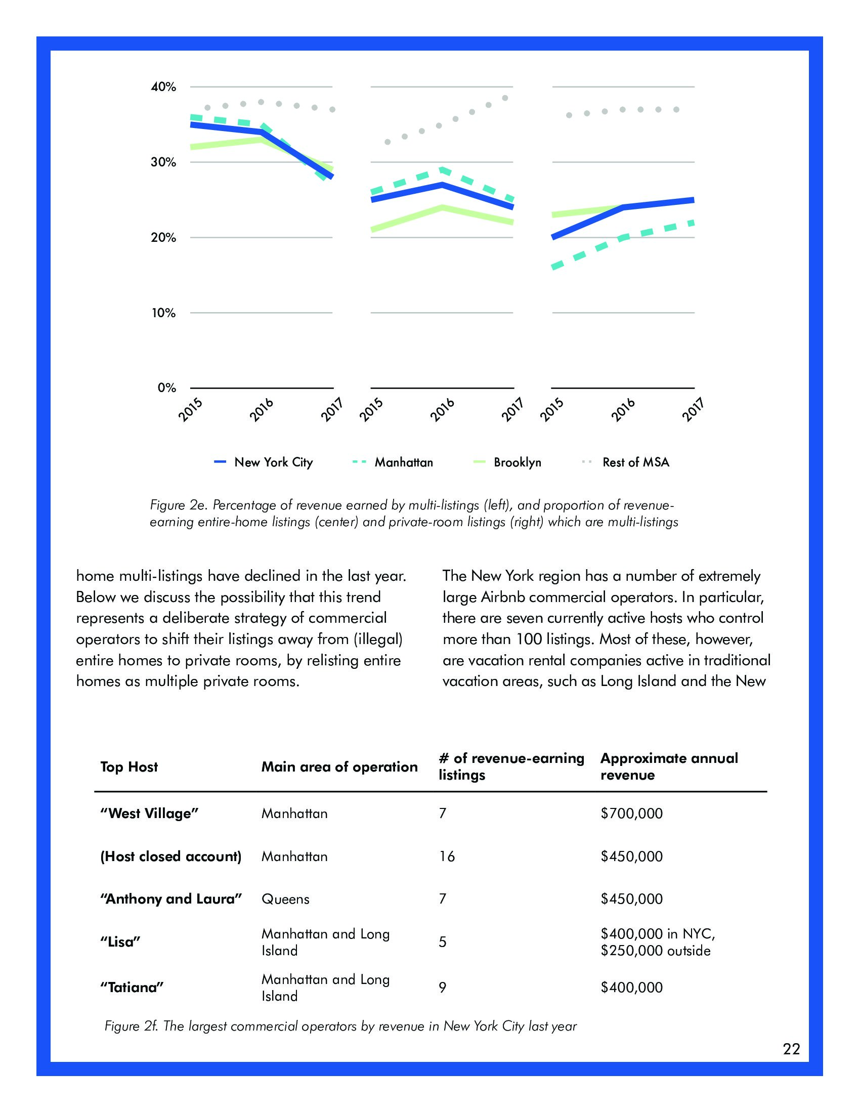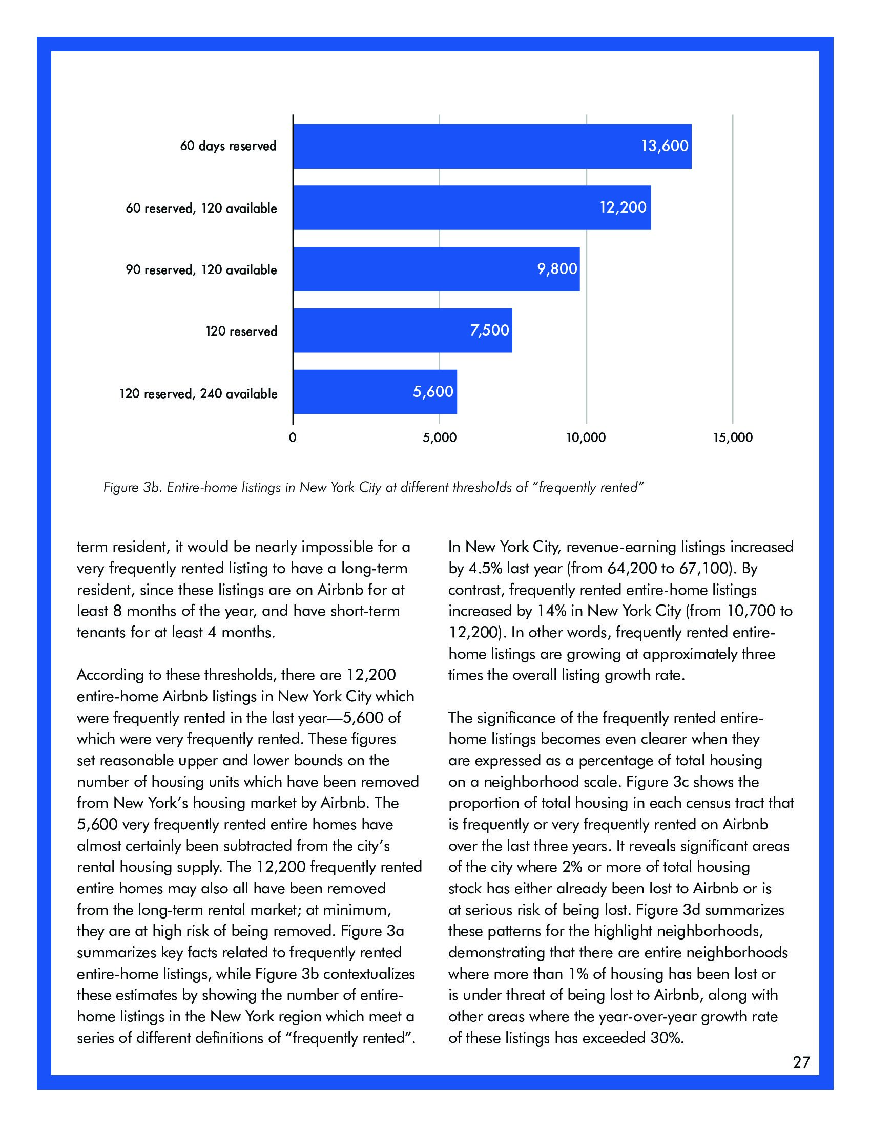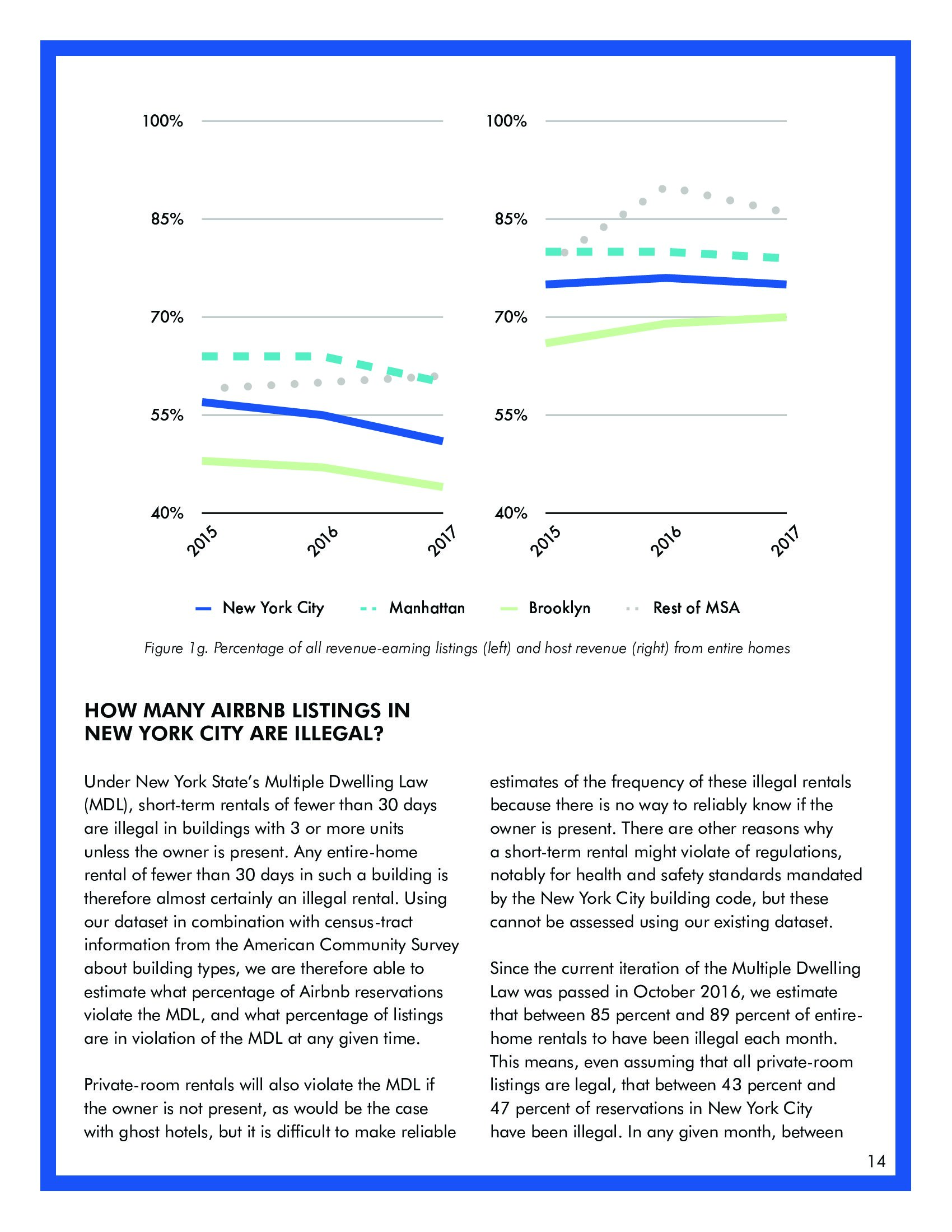 2/3的收入是非法的。整栋或公寓占Airbnb收入的75%,4.9亿美元。根据纽约州法律,87%的整租是非法的,这意味着Airbnb 纽约去年66%的收入和45%的预订是非法的。
