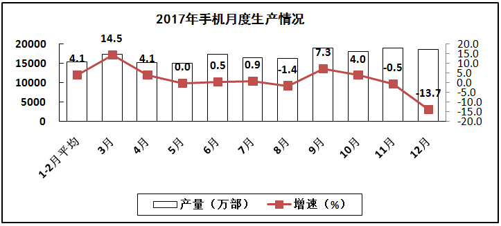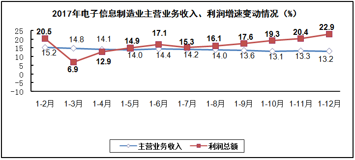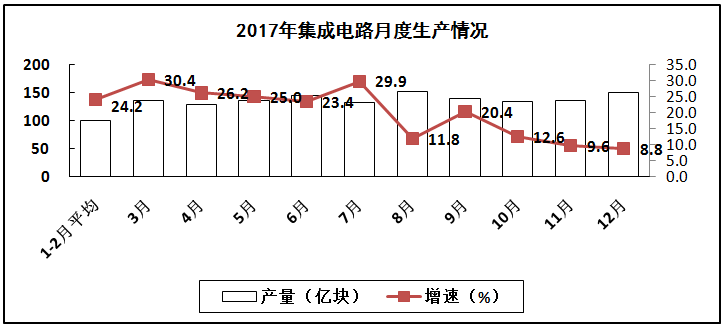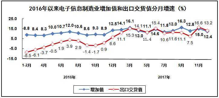 生产保持较快增长。2017年,规模以上电子信息制造业增加值比上年增长13.8%,增速比2016年加快3.8个百分点;快于全部规模以上工业增速7.2个百分点,占规模以上工业增加值比重为7.7%。其中,12月份增速为12.4%,比11月份回落2.6个百分点。