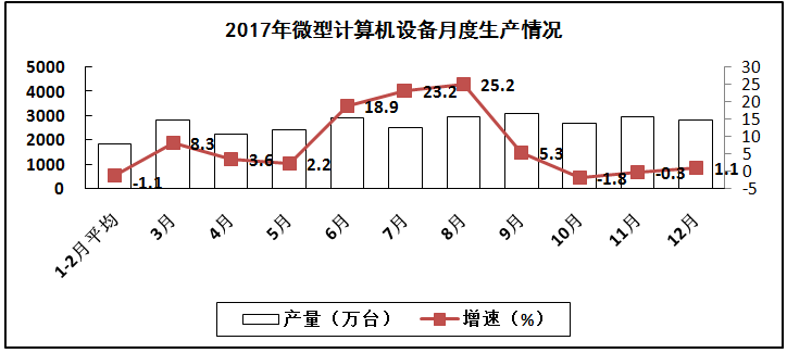 计算机行业生产、出口情况明显好转。2017年,生产微型计算机设备30678万台,比上年增长6.8%(2016年为下降9.6%),其中笔记本电脑17244万台,比上年增长7.0%;平板电脑8628万台,比上年增长4.4%。实现出口交货值比上年增长9.7%(2016年为下降5.4%)。