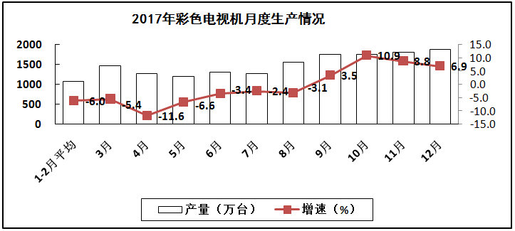 家用视听行业生产持续低迷,出口增速加快。2017年,生产彩色电视机17233万台,比上年增长1.6%,增速比2016年回落7.1个百分点;其中液晶电视机16901万台,比上年增长1.2%;智能电视10931万台,比上年增长6.9%,占彩电产量比重为63.4%。实现出口交货值比上年增长11.8%,同比加快10个百分点。