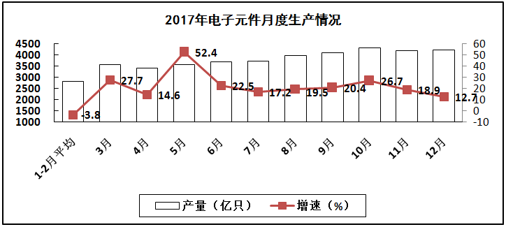 电子元件行业生产稳中有升,出口增速加快。2017年,生产电子元件44071亿只,比上年增长17.8%。实现出口交货值比上年增长20.7%,增速比2016年加快18.1个百分点。