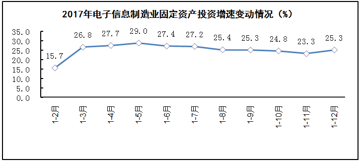 固定资产投资保持高速增长。2017年,电子信息制造业500万元以上项目完成固定资产投资额比上年增长25.3%,增速比2016年加快9.5个百分点,连续10个月保持20%以上高位增长。电子信息制造业本年新增固定资产同比增长35.3%(2016年为下降10.9%)。