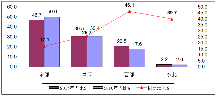 西部地区投资增速领跑,东北地区投资明显好转。2017年,东部地区投资增长平稳,完成投资同比增长17.1%,增速比2016年回落1.6个百分点,其中河北、广东投资增长较快,分别增长46.4%和41.9%;中部地区投资增长较快,完成投资同比增长25.7%,增速比2016年提高11.7个百分点,其中江西、安徽投资增长较快,分别增长76.2%和24.6%;西部地区投资增速领跑,完成投资同比增长46.1%,增速比2016年提高26.3个百分点,其中云南、贵州、四川投资增长较快,同比分别增长338.9%、120.9%和118.0%;东北地区投资由降转升,完成投资同比增长39.7%(2016年为下降29.6%),黑龙江、辽宁投资分别增长109.7%和60.8%。