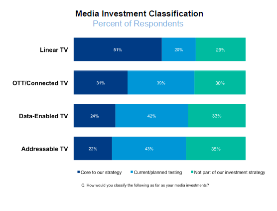目前,超过半数的广告客户和广告代理商(51%)表示传统线性电视仍然是2018年广告策略的核心。很多受访者将更先进的电视广告整合到2018年广告策略。31%的受访者将联网电视作为2018年广告策略的核心,22%将可寻址电视作为核心。分别还有39%和43%的受访者将联网电视和可寻址电视加入广告策略,尽管不是作为核心。