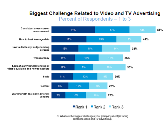 Videology还分析了电视广告客户和广告代理商面临的一些困难。51%的受访者选择跨屏幕测量,44%的受访者面临着如何最好地利用数据方面的挑战。超过1/3的受访者认为他们最大的挑战是不了解什么事有效的广告及如何执行。