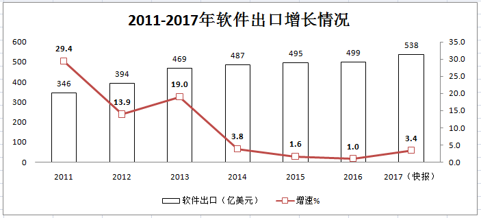 出口形势仍然低迷,但进入下半年以后情况有所改观。2017年,全国软件业实现出口538亿美元,同比增长3.4%,增速比上年提高2.4个百分点。其中,外包服务出口增长5.1%,比上年提高4.4个百分点;嵌入式系统软件出口增长2.3%。
