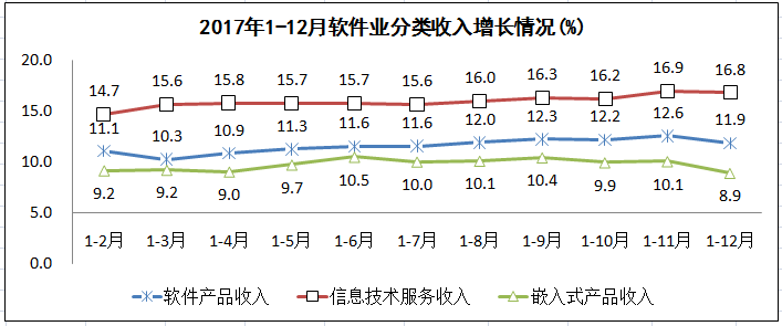 快报数据显示,2017年我国软件和信息技术服务业继续呈现稳中向好运行态势,收入和效益同步加快增长,出口有所恢复,吸纳就业人数平稳增加,创新能力不断提升,产业结构持续调整优化,服务和支撑保障能力显著增强。