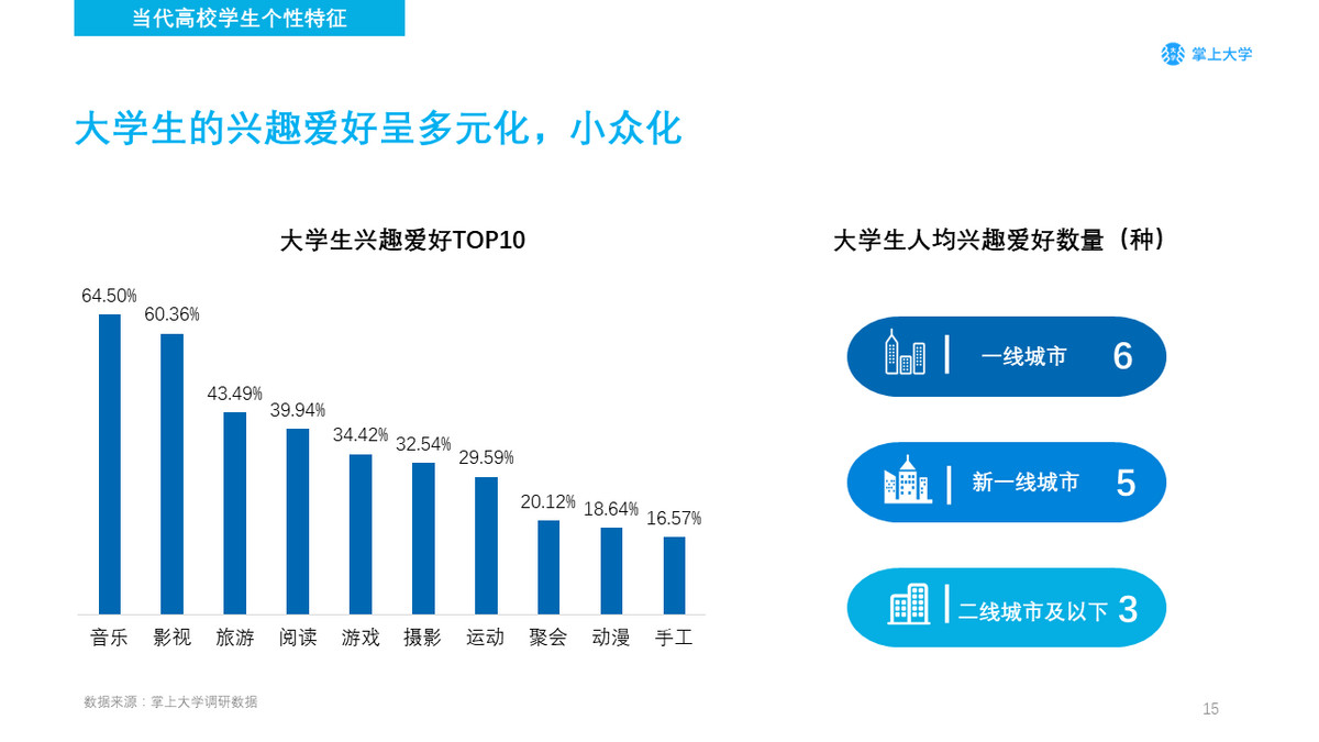 根据调查,在大学生群体中,兴趣的多元化已经是一种不可阻挡的趋势。音乐已超越影视、旅游成为当代大学生最感兴趣的话题,从学生的兴趣爱好TOP10中可以发现,已经有小众的兴趣爱好开始出现,有16.57%的大学生喜爱手工。从城市级别维度上对比,一线城市的大学生兴趣爱好最为广泛,人均高达6种,可见城市的经济发展规模、娱乐生活的多样性也是影响学生多元化兴趣爱好的重要因素。