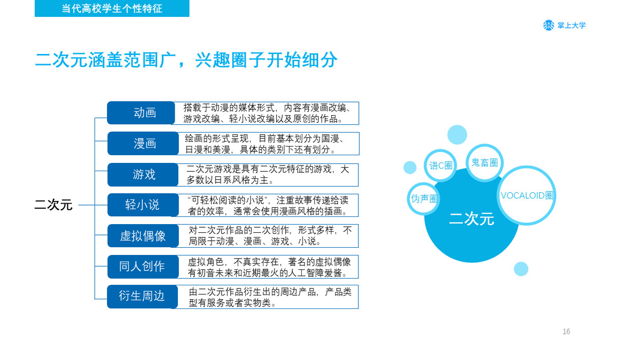 大学校园是二次元文化培养的温室,面对高校中日益增多的二次元社团、社群,二次元文化已经成为大学生生活中的一部分。二次元是个极其广泛的圈子,但是对于当代的大学生而言,只有越是细分的兴趣圈子才能越容易找到共同的话题,也越有认同感,随着二次元的不停细分,也衍生出了许多小众兴趣圈,像语C圈,鬼畜圈等。
