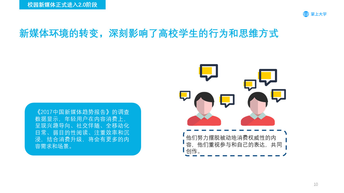 我们进入新世纪才短短18年,然而传统媒体的概念已经荡然无存——甚至数字媒体的创新者们也在面临被颠覆的命运。这一场变革下,太多原有的认知需要被重塑和归零。如今的新一代用户群体,尤其是我们一直讨论的高校人群,他们的世界观、接受内容的形式,已经发生了根本性的变化。