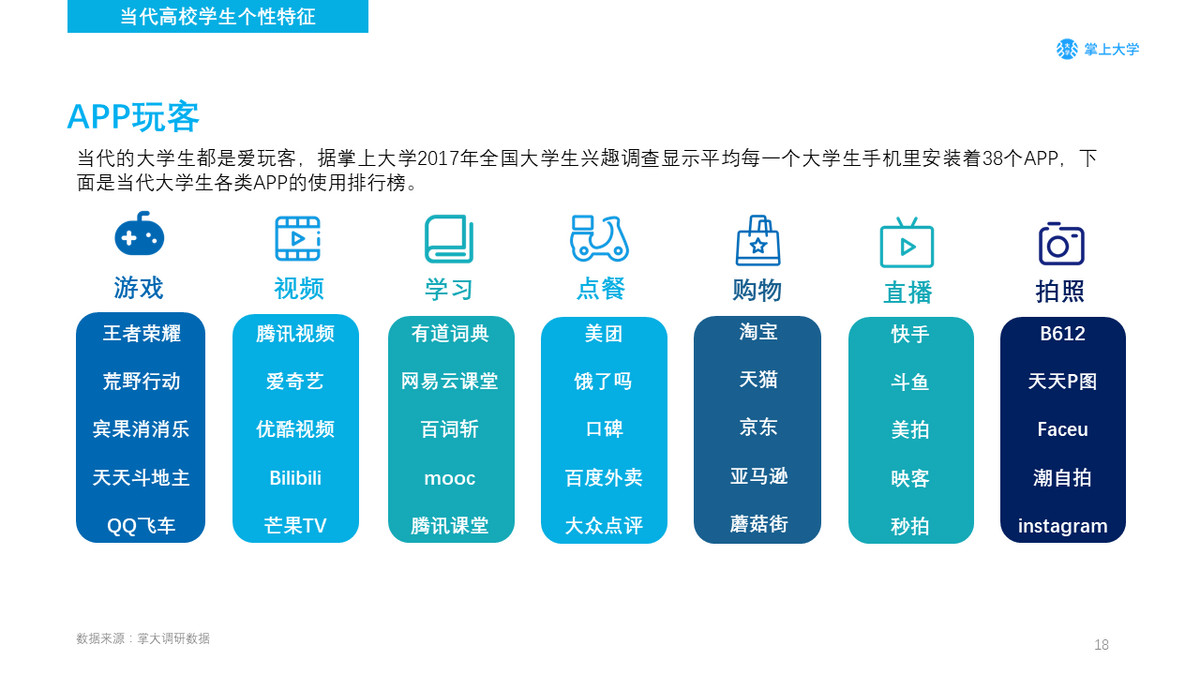 当代的大学生都是爱玩客,据掌上大学2017年全国大学生兴趣调查显示平均每一个大学生手机里安装着38个APP,下面是当代大学生各类APP的使用排行榜。