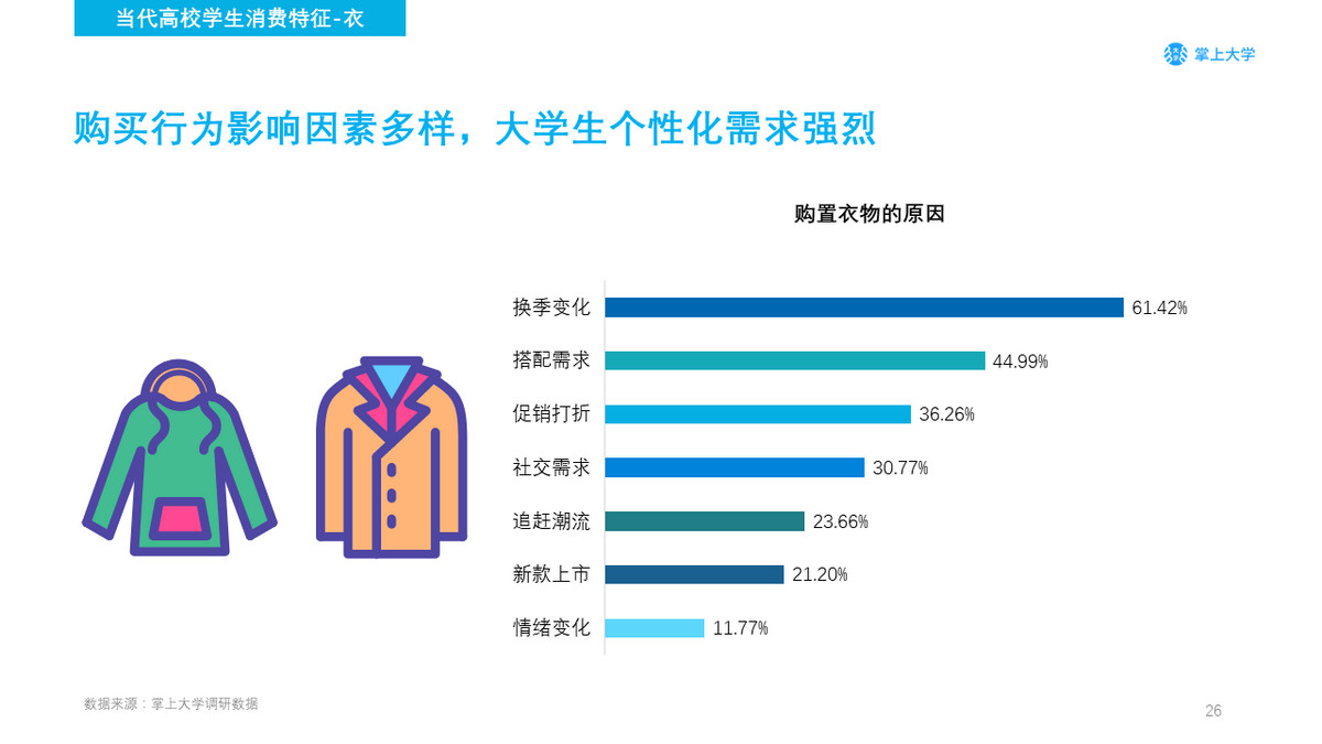 换季变化是大学生购置衣物最大的影响因素,搭配需求说明了当代大学生注重根据个人喜好,完成个性化的搭配。从搭配需求中也能反应出学生一定的社交需求,在社交中可以表现出自己的风格。部分学生也会因为“情绪变化”而产生购买行为,他们通过服装搭配来表达自己的情绪,足够说明大学生人群是极具追求个性化需求的人群。