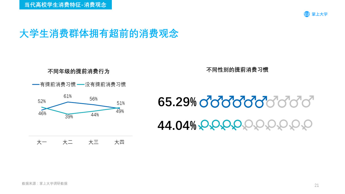 在大学生群体中,54.26%的学生有过提前消费的行为,对比年级的不同,大二学生的提前消费习惯占比最高,大一学生占比最低。对比不同的性别,男生更加热衷于提前消费,占比高达65.29%。提前消费在学生群体中已是一种的被认可的消费观念。