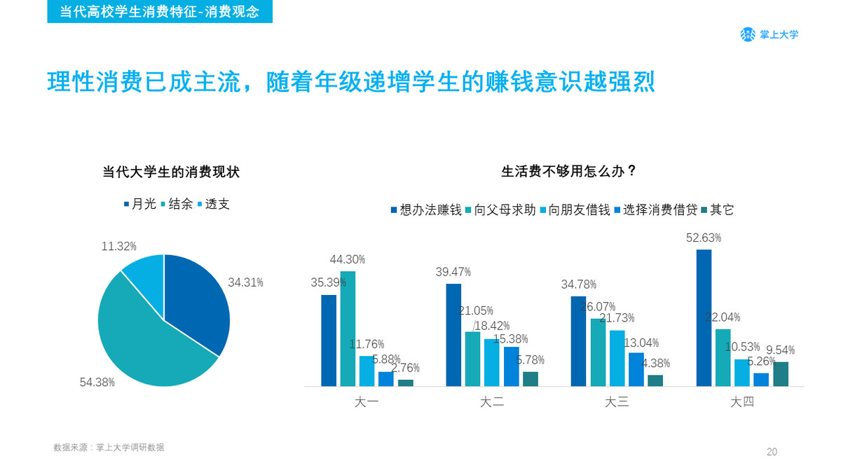 在当代大学生中,月光不再是大多数学生的消费现状,有计划的消费已占据主流。当学生面对支出大于可支配金额时,大一的新生更多会选择和父母求助,其比例在大一新生中为44.30%,而随着年级的递增,这一比例开始大幅缩减,依靠自己赚钱的学生占比开始扩大,在大四的学生中,当生活费不足时,自发赚钱的比例扩增到52.63%。
