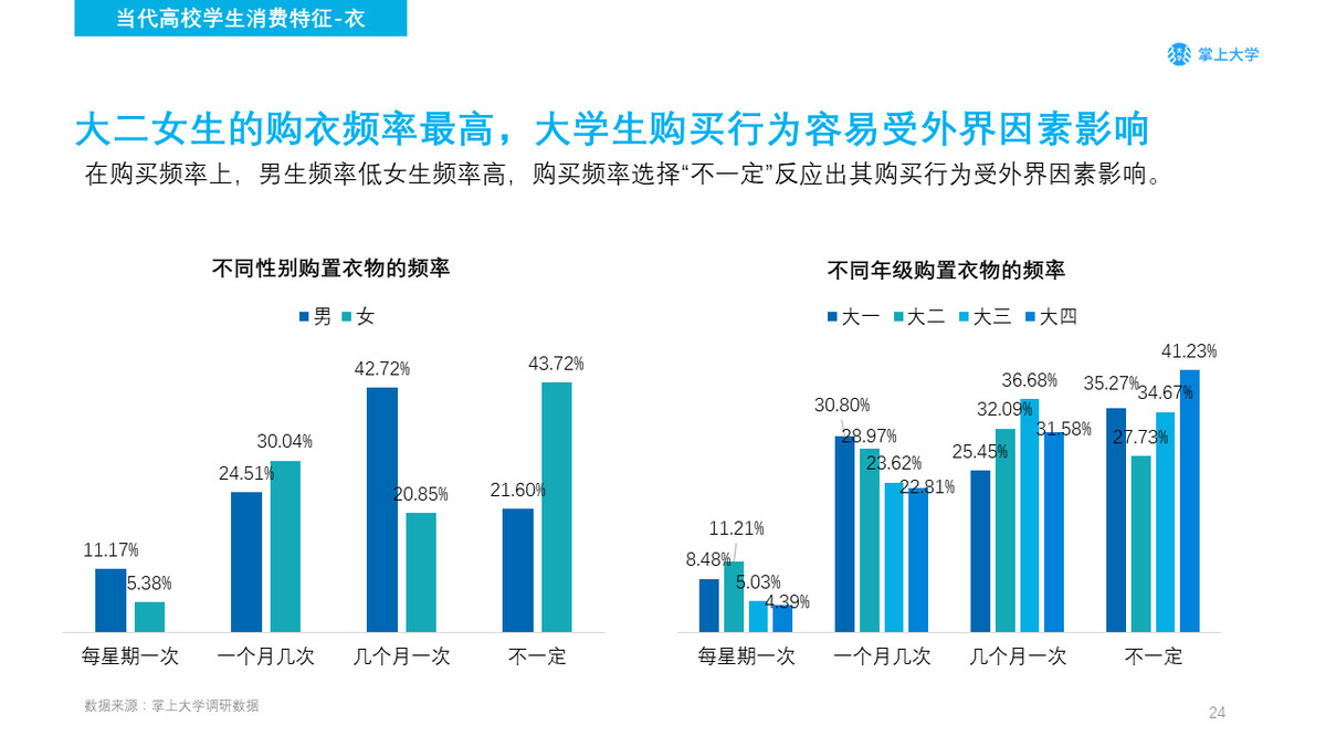 相比不同的性别,女生是最容易受到外界影响的群体。在不同的年级中,大二学生的购衣频率更高,大四学生的购衣频率最低,但大四学生不确定性最高。