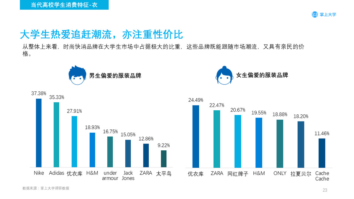 校园中,男生更加偏好运动品牌的服装,其次是时尚快消品牌。女生不同于男生,最偏爱的品牌是时尚快消品牌,紧跟其次的是网红原创品牌。大学生对时尚快消品牌的偏爱,展现了现代年轻消费者既乐于追赶潮流又关注性价比的消费心理。