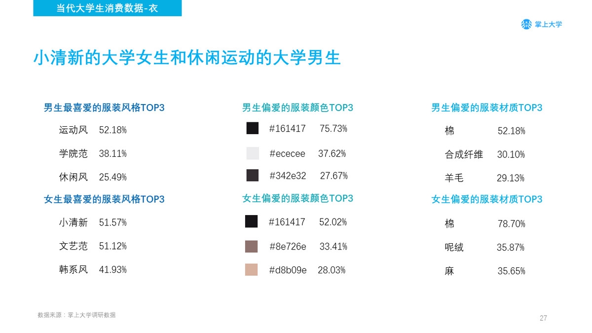 男生和女生最大化的差别在于女生在服装上有着多样化的需求而男生则没有女生那么强烈。男生最爱运动风,最爱的黑色,在他们眼里棉是最好的材料,合成纤维则更具有功能性,羊毛更保暖,注重实用性。女生偏爱的服装风格小清新和文艺范相差无几,颜色则偏向于多样化,她们更爱舒适的棉。