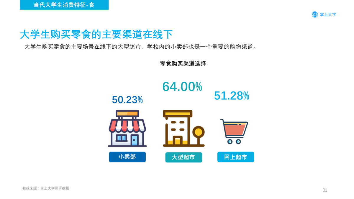 其次约有51.28%的学生会在网上商店进行选购。可见在未来绝不是单一渠道一家独大,而是需要线上+线下结合的OMO模式。
