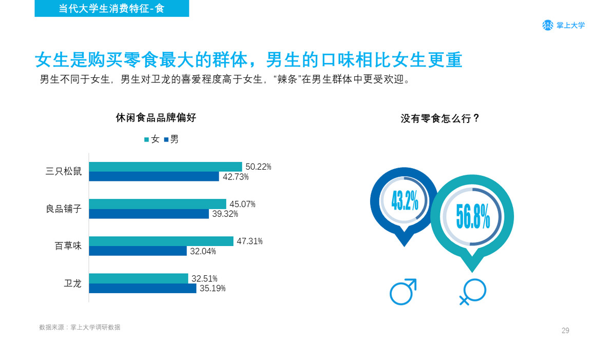 在大学生人群中,零食作为正餐的补充具有巨大的消费市场。认为”没有零食怎么行”的学生中,女生占比56.83%,男生占比43.17%,可见女生相比于男生而热爱零食。在零食品牌偏好中,最受女生欢迎的品牌是三只松鼠,其次是百草味。