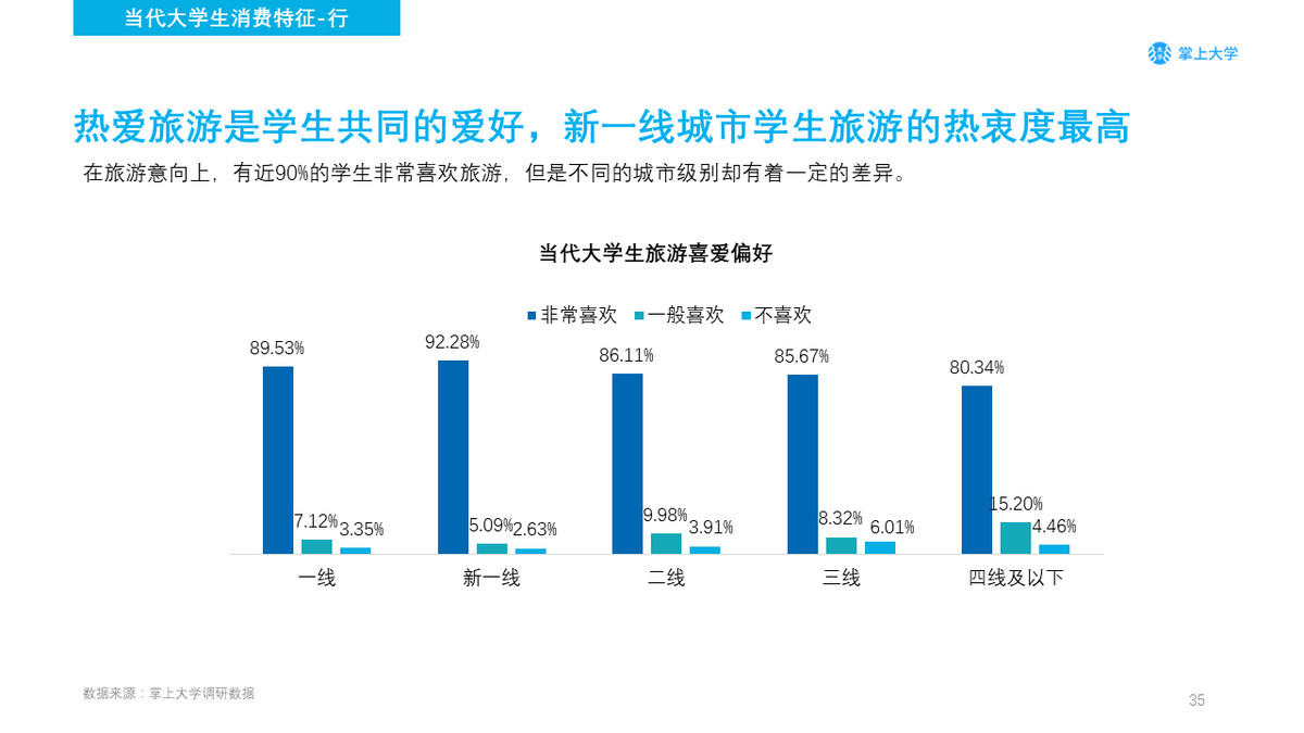 新一线城市非常喜欢旅游的学生占比略高于一线城市,而四线及以下的城市则只有80.34%的学生非常喜欢旅游,15.20%的学生一般喜欢。引起这一差异的主要原因可能是不同级别城市的消费水平和文化氛围差异引起的。