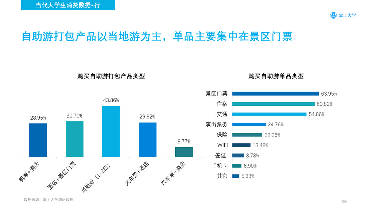 自助游打包产品占比最高的是当地游,可以看出学生喜欢通过当地游来深入了解当地的文化,自助游单品中最高的是景区门票,借助于网络商店的发展,通过网络来购买景区门票比现场购买能减少许多的支出,对于学生而言,这也是性价比最高的单品之一。