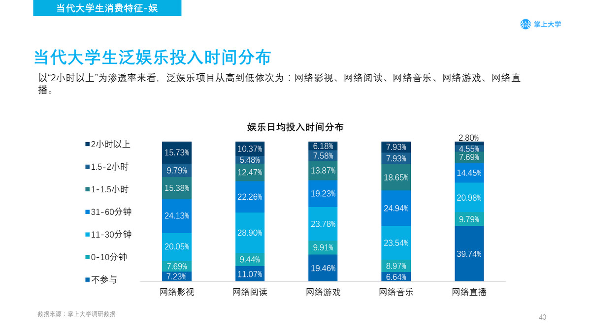 根据调研数据进行统计测算,大学生在网络影视上日均花费31-60分钟,网络阅读日均花费31-60分钟,网络游戏日均花费31-60分钟,网络音乐日均花费31-60分钟,网络直播日均花费11-30分钟。