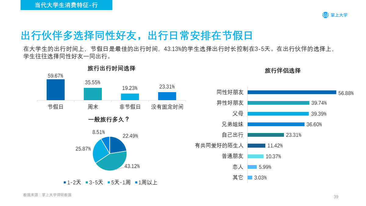 在大学生的出行时间上,节假日是最佳的出行时间,43.13%的学生选择出行时长控制在3-5天。在出行伙伴的选择上,学生往往选择同性好友一同出行。