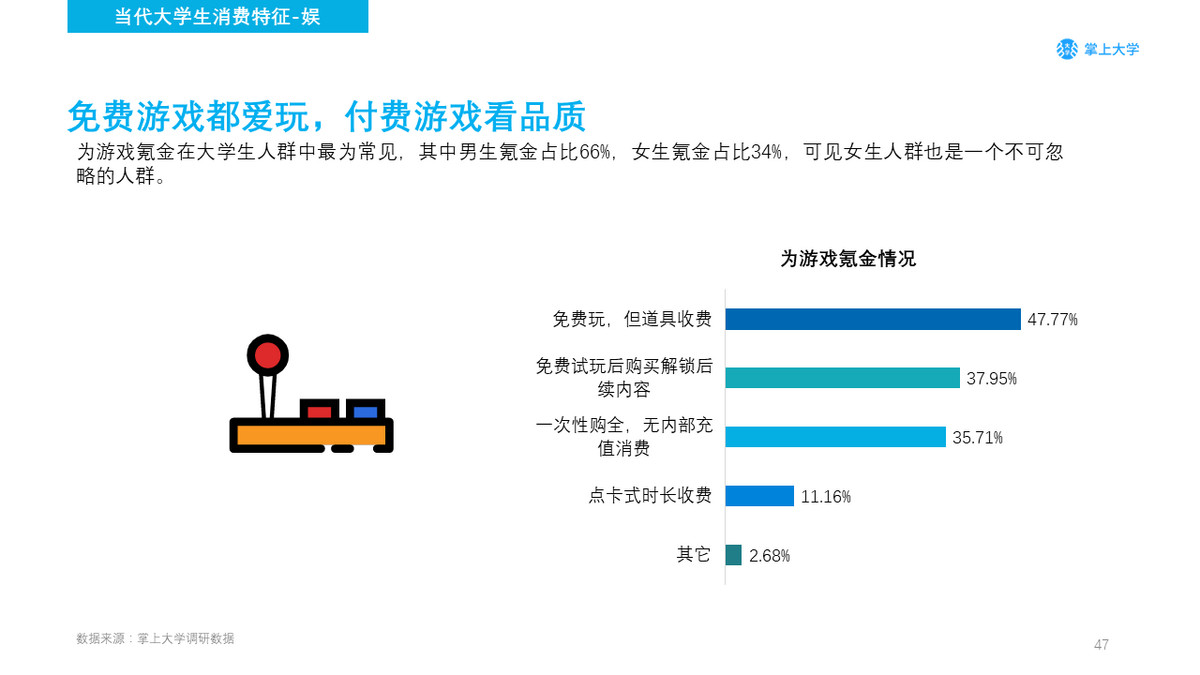 对于游戏收费制度,47.77%的学生表示可以接受游戏免费,但道具收费,而37.95%的学生认为可以免费试玩后在购买解锁后续内容,从中可以看出学生对于未体验过的游戏很难为其付费。
