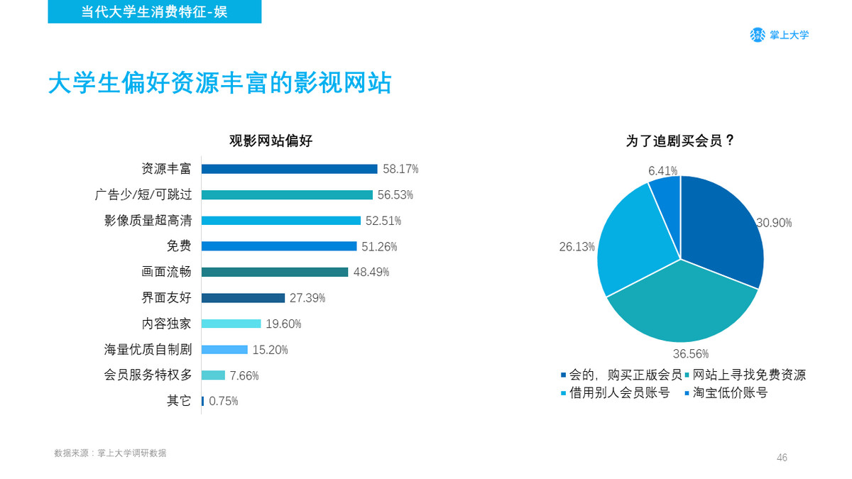 观影网站资源丰富、广告少、影像质量超高清为基本需求,大学生对于观影网站注重观影体验。为了追剧购买会员的行为占据30.90%,排在第一的依然是寻找免费资源,大学生的版权意识还有待加强。