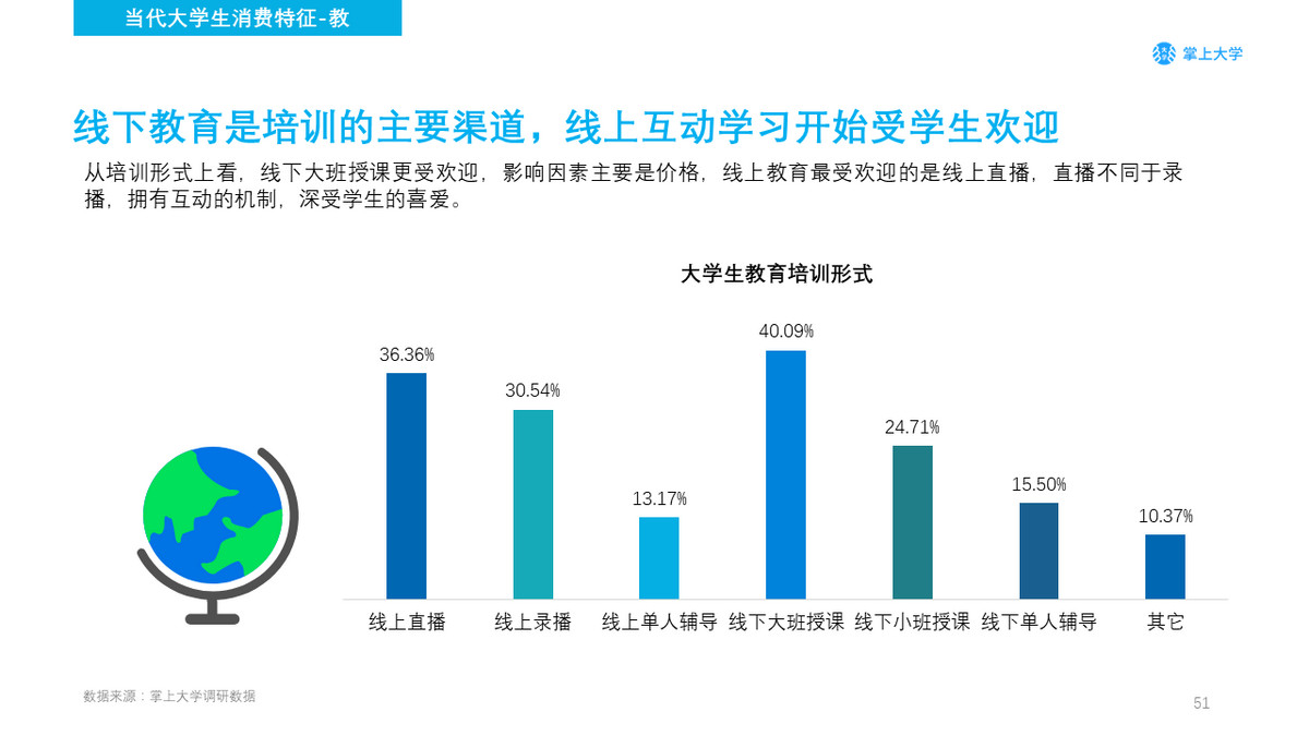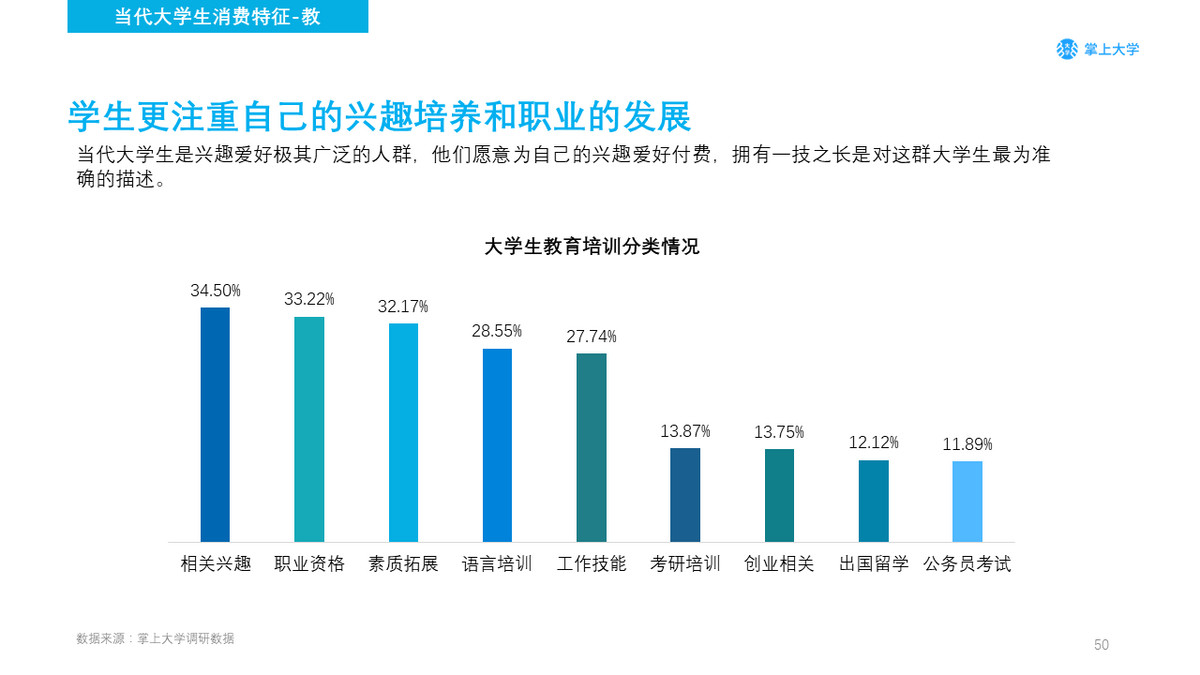 当代大学生是兴趣爱好极其广泛的人群,他们愿意为自己的兴趣爱好付费,拥有一技之长是对这群大学生最为准确的描述。除去兴趣培养之外,他们还注重进入社会后的职业发展,他们参与职业资格培训、素质拓展、工作技能都能为未来的职业生涯加分。