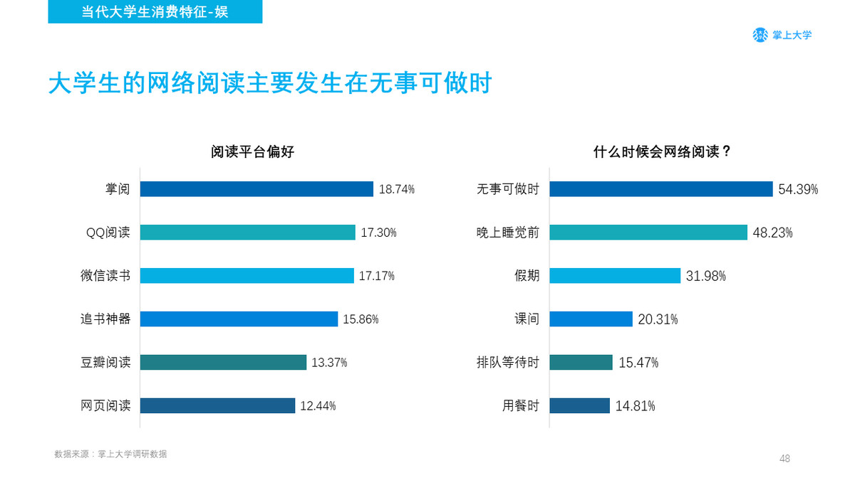 在阅读平台中,掌阅是大学生最受欢迎的阅读软件,诸多阅读软件之间并没有拉开太大的差别,主要在于同质化的阅读体验。学生在阅读场景上,主要在无事可做的时候,还有晚上睡觉前,学生都会选择进行阅读,无事可做时利用阅读来打发时间,晚上睡觉前往往排除了外界的干扰,是专注度最高的时候,更加适合阅读。