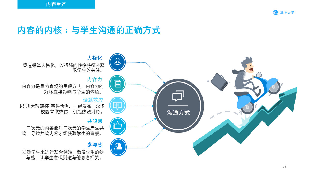 每一次内容的产生和传递,都是与学生的一次沟通,传递相对应的信息。将与学生进行一次深刻且有效的沟通是统领内容的核心,如何与学生进行沟通,方式并没有局限性。