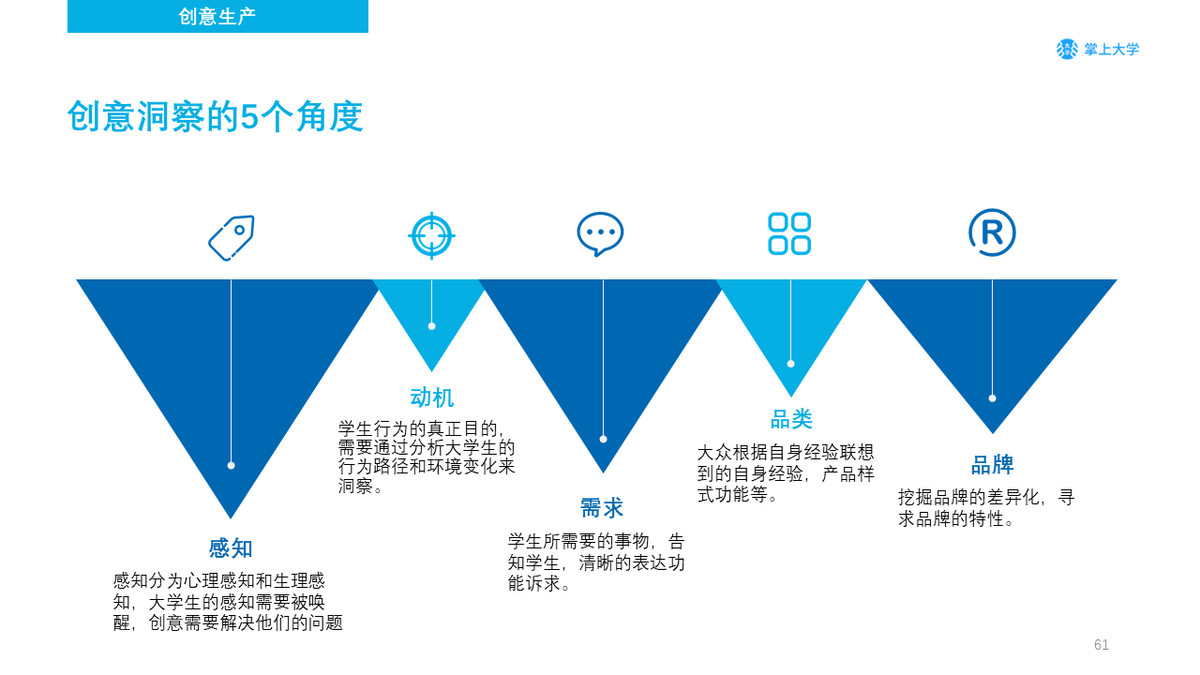 面向学生人群的新媒体营销,让学生玩起来是极其重要的一点。洞察学生人群,通常用以下5个角度:感知、动机、需求、品类、品牌。通常先感知学生的状态,感知可以分别生理和心理,其次会产生动机和需求,然后再是考虑到品类和品牌。