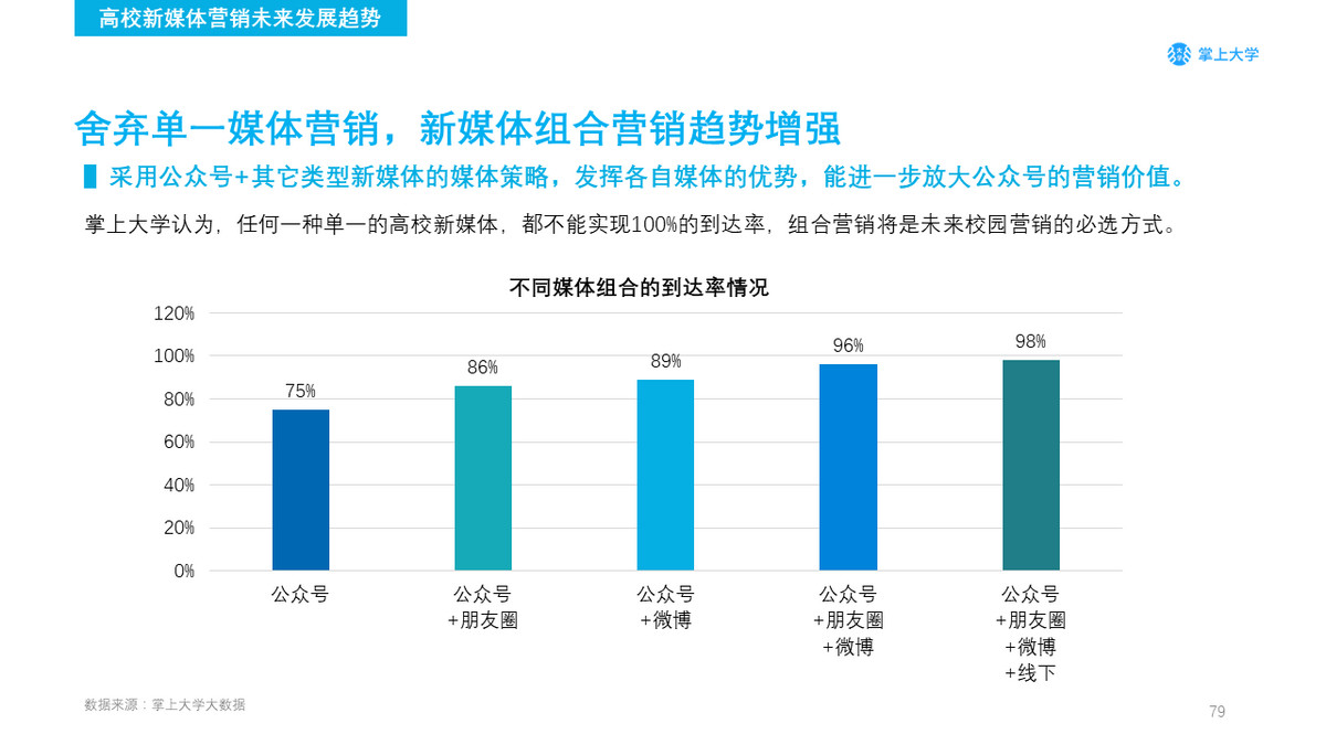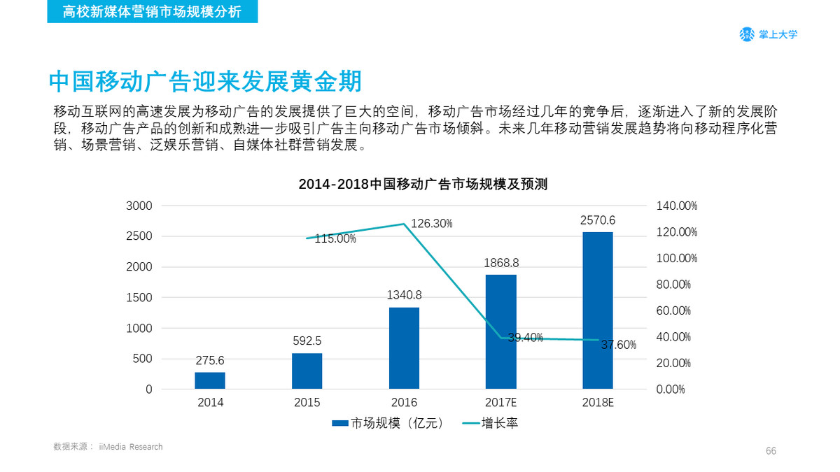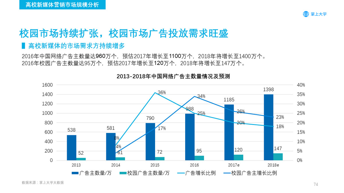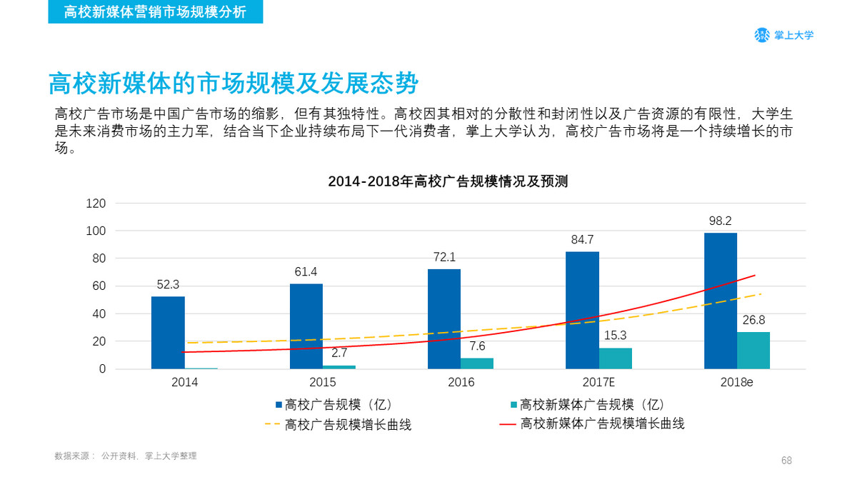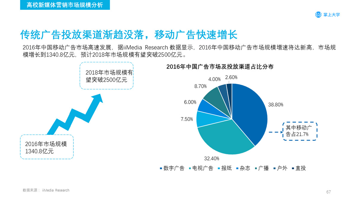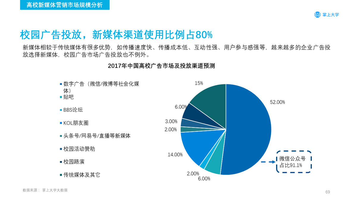 掌上大学预测2018年高校广告市场新媒体的渠道使用占比将有可能突破85%。
