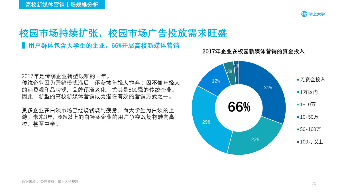 调查数据显示,用户群体包含大学生的企业,66%开展了高校新媒体营销,营销投入在1~10万的比例达29%。掌上大学认为,随着00后大学生进入高校,95后大学生走进社会,未来将会有更多的传统企业投入更多的资金进行校园营销,让品牌掌握年轻人的“心”。